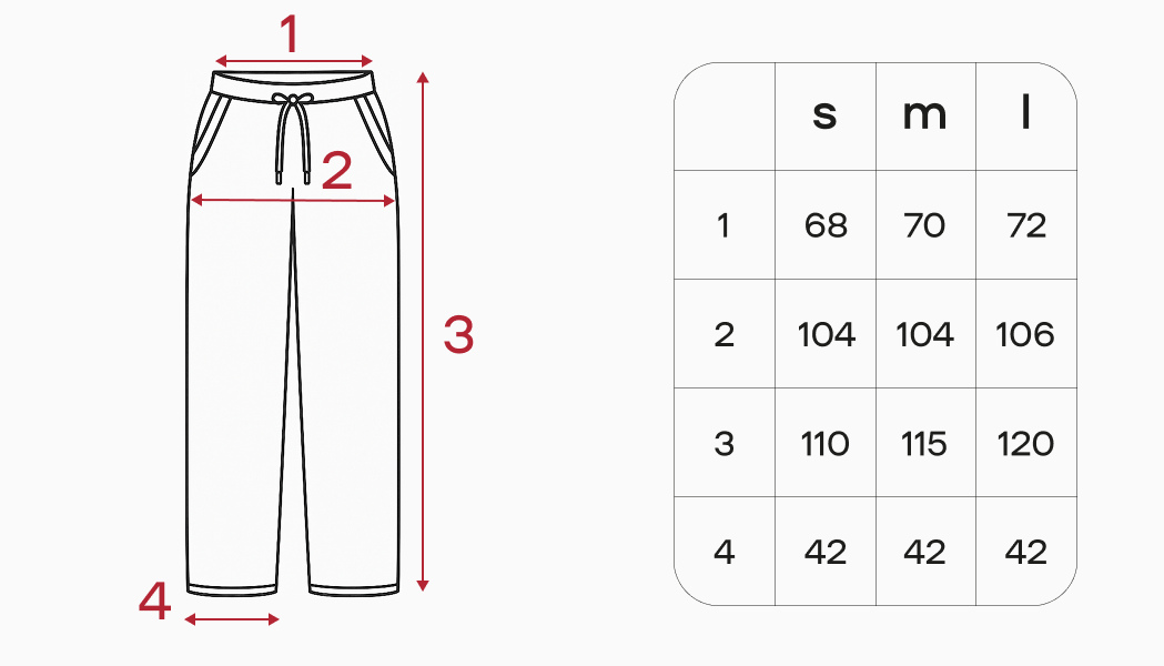 — 1 и 2 обхваты, 3 длина изделия с поясом, 4 ширина брючины (не обхват)